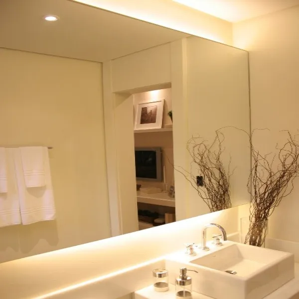Outra aplicação relevante é em banheiros integrados a quartos ou áreas sociais, onde o espelho orgânico contribui para criar uma atmosfera sofisticada e acolhedora, integrando-se harmoniosamente ao restante da decoração.